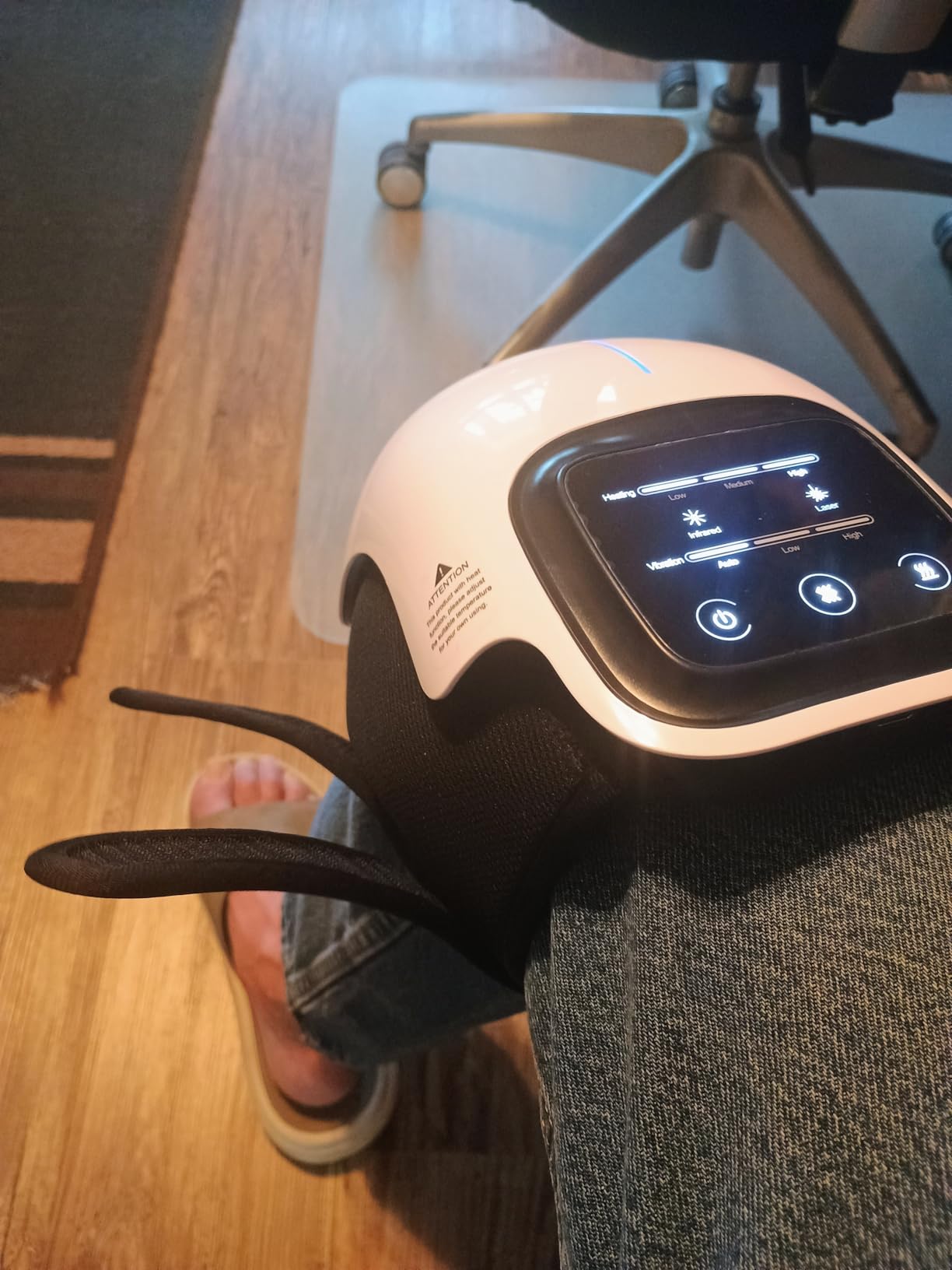 AuraKnee™ wykorzystuje kombinację kompresji powietrznej 3D, głębokiego promienowania podczerwonego (IR) oraz mikrowibracji. Urządzenie stabilizuje kolano, a wybrany tryb pracy aktywnie niweluje napięcie stawowe i stymuluje krążenie.